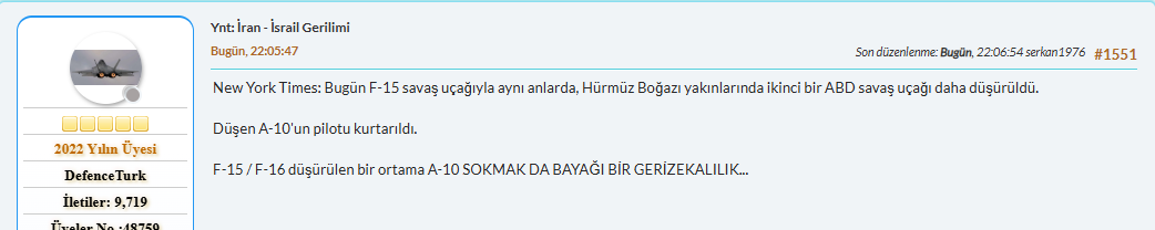 New York Times: Bugün F-15 savaş uçağıyla aynı anlarda, Hürmüz Boğazı yakınlarında ikinci bir ABD savaş uçağı daha düşürüldü.